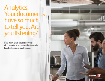 Xerox® Document Analytics provide insights that lead to savings and efficiencies through digitization, workflow optimization and distributed access. This service finds ways to make document infrastructure more productive through efficient processes and reduced document storage and costs. It incorporates traditional Managed Print Services (MPS) device data, print job details, audits of filed and unfiled paper, and client surveys. MPS data pinpoints paper-intensive processes with greater speed and accuracy compared to traditional consulting methods. Qualitative data reveals why documents are printed and stored. Innovative, proprietary Xerox® tools, analysis, visualization and modeling provide deep insight. Comprehensive reports turn raw data into actionable steps.
